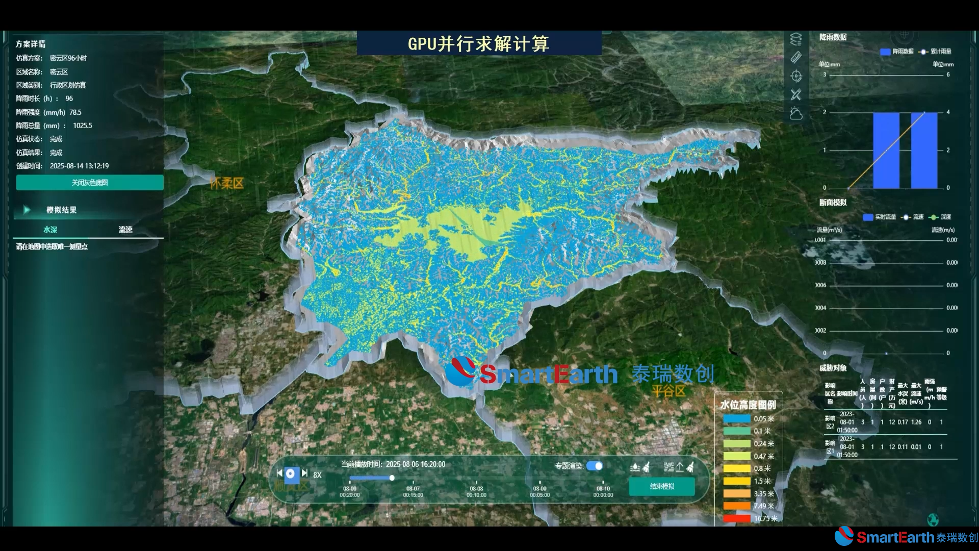 目前,专业的高性能山洪仿真引擎PWSim采用GPU并行算法,通过GPU并行计算能力,大幅提升计算效率,实现了五分钟内完成千万级网格(1m分辨率下可覆盖10平方公里区域范围)1小时降雨量模拟计算的突破,相比传统软件,速度提升十倍以上。